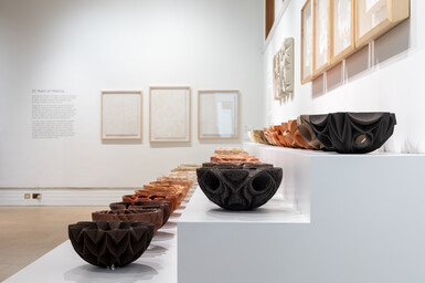 HC: Well, all clays do react differently so a lot of the time I take chances on them. I got two Compton clays, one was dug from the locality and then from just a bit further afield about a mile or so. I call them Compton 1 and Compton 2, so Compton 1 is the commission clay and Compton 2 is that one what was dug out a mile away. Compton 2 had no plastic in it. It was very gritty and hard to use, even though it was sieved, so what I‘ve done is a small relief tile with the clay once it’d been sieved and purified, but then I’ve done another two in that same one. One that has ball clay in it, which adds plasticity to the clay, so I’ve put some of that in it, and I’ve made three wall pieces out of it, so one is natural, one has got ball clay in it, and one has got bentonite, which is another plasticiser for clay.