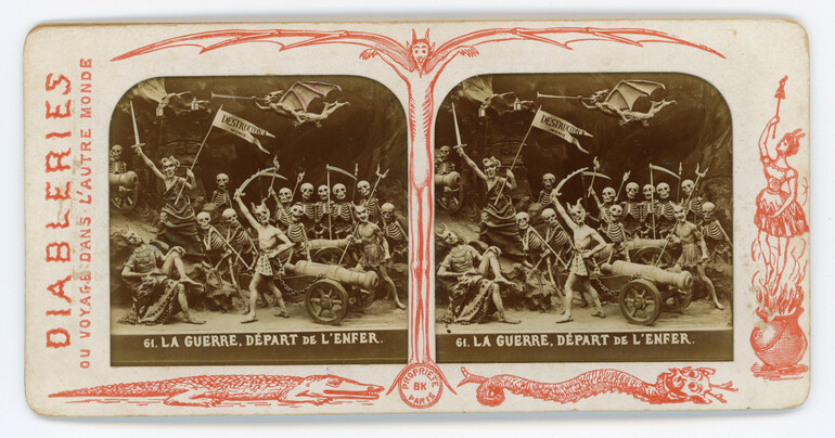 La guerre-départ de l’Enfer (War, departure from Hell), No. 61, Louis Alfred Habert (1824–1893), modeller, Adolphe Block (1829–1903), publisher, 1870s, Albumen back-tinted print on paper with tissue on cardboard mount.