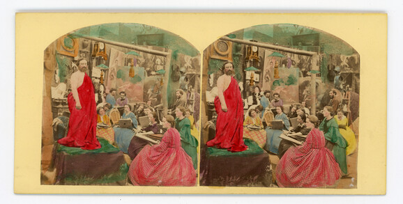 During the nineteenth century, access to art was mainly limited to the elite. Stereoscopy offered an affordable way for more people to enjoy three-dimensional representations of art and artistic spaces. Images in this section include photographs of sculpture and sculptors at work, human recreations of famous paintings, painting copyists set up in a gallery and a rare image of a female artist’s studio.