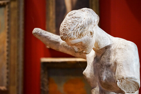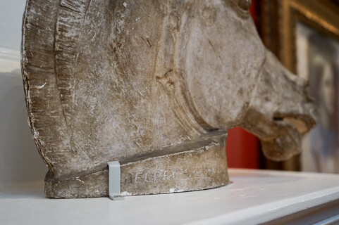 When cleaning artworks and objects, you get the opportunity to get up close and see them in much more detail than usual. This is useful for collections care, as it allows us to check on the object's condition whilst on display and spot any issues. Sometimes you'll spot something interesting, like a fragment of newspaper from 1902 which Sarah spotted in George's paint table. We also noticed some words etched into G F Watts's plaster cast of a chariot horse from the Parthenon, which is placed on the mantelpiece. Finally, we spotted the title of the Mary Watts' ornate fireplace, Love and Life, carved into the lower left corner. This was also the theme of a number of works by G F Watts, including a painting displayed nearby. See if you can spot these hidden details on your next visit.