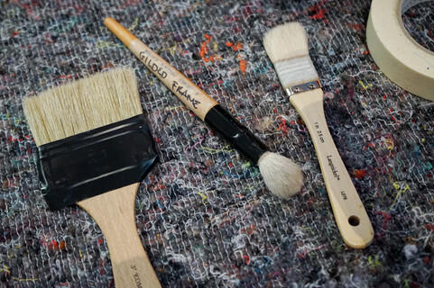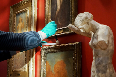 It's important to use the right tools and materials when working with artworks and sculptures to help preserve them. A soft goat-hair brush is reserved for the gilded frames of Watts's paintings, which have extremely fragile surfaces. Slightly stiffer, hog-hair brushes are used for dusting the furniture and sculptures. The metal on the brush is covered with tape to prevent it from scratching.
