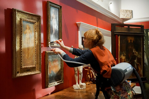 Much like any building, particles from upholstery, rugs and people's skin and clothes accumulate on the surfaces over time. Cleaning must be done carefully and as minimally as possible, to balance the risks posed by dust with the disturbance that cleaning can cause. Dust attracts insects into our spaces and provides food, which can lead to damage. Over time, it can cause objects to lose their vibrance and obscure their details. To remove it, Sarah uses a selection of different natural-hair brushes, gently sweeping their surfaces. She uses a vacuum cleaner with variable suction and a long hose, covered with a piece of gauze fabric. This allows her to catch dust as soon as it is disturbed with the brush, preventing it from settling on other surfaces. The gauze prevents larger fragments from being sucked into the vacuum cleaner.