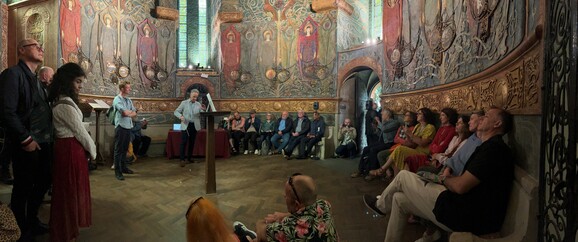 Joseph: Because this project has so many different strands and involves different countries, I'm trying to bring the sounds of those places, both of Ireland and Estonia, to Watts in order to kind of link this whole project together, alongside some recollections of the history of the Watts Artists' Village itself. My PhD in Ireland was at a historic house in the Republic, working with an aristocratic family and their family archives, which stretched back over 400 years, but these archives are not part of a public collection. I created a 90-minute sound trail called The Ancestors which was in the grounds of their estate. As you walk through the formal gardens, you encounter the ghosts of the archive, as it were. That was very fresh in my mind, so initially, I was interested in the archives that you had here. I talked to staff and people that have been on the estate for a while who had memories about those kinds of things. And then interestingly, I also got interested in the graveyard because the grave of Aldous Huxley is there, who wrote The Doors of Perception. For me, the 'doors of perception', if you like, were opened by the Chapel. It's an extraordinary rendition of the heavenly realm, with the angels and the biblical quotations, the colour and the Celtic symbols. That set me thinking about the soundscape that I wanted to create in that space to open up those doors of perception through sound. Those were the two things that I'm trying to weave into the work that I'll be creating for the sound trail.