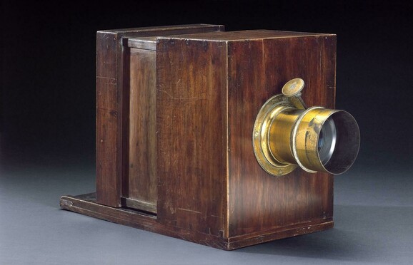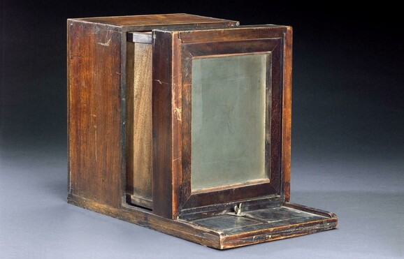 Unknown, Wet Plate Camera, 1855. Brass (copper, zinc alloy), mahogany (wood) and glass, 265 x 460 x 200 mm.