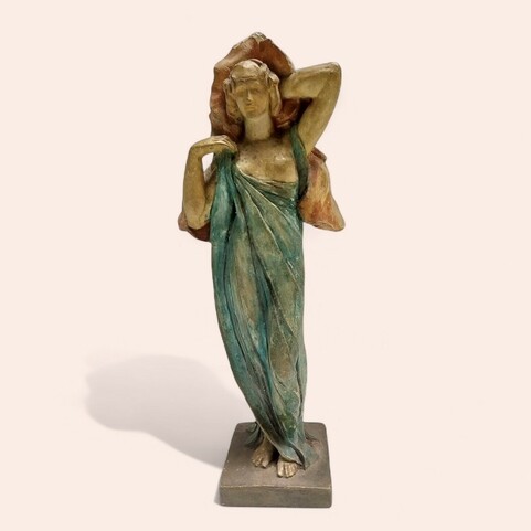 The “flower girls” are rare figures from the Compton Pottery, and hitherto unknown examples of this form coloured. The first examples to enter the Watts Gallery collection, both figures are exquisitely detailed with the stems of the flowers twisting around their bodies and petals blooming behind their heads. The marks on the base of Rose identifies her as from the Potters Arts Guild (1904-1936). Iris has “HN” scratched into the base, suggesting she was made by Harold Neal, potter, (1890-1941).