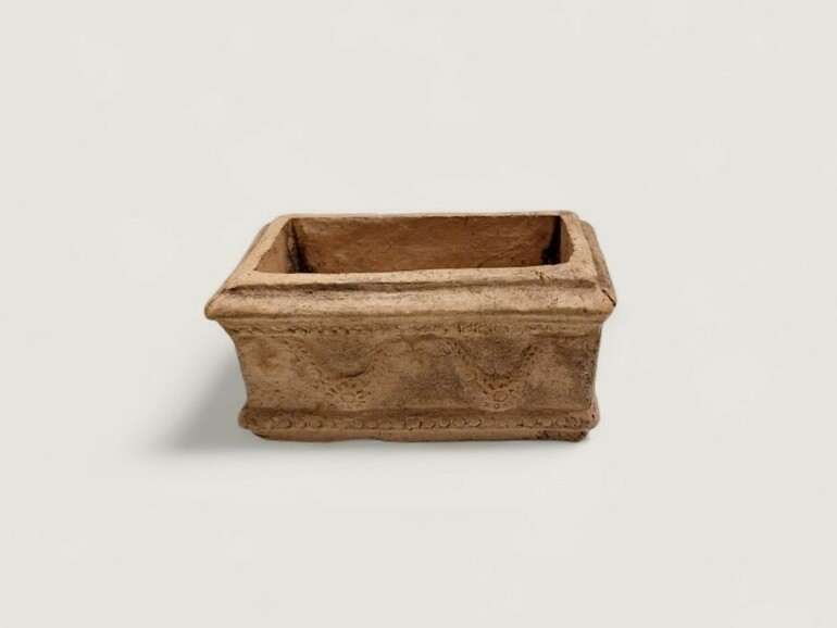 Queen Mary’s Doll House (now in the Royal Collection) was built 1921-24 by Edwin Lutyens (1869-1944), with gardens designed by Gertude Jekyll (1843-1932). The Compton Pottery produced the pots for the Dolls House’s garden, making in miniature, versions of pots already in production. The pot now in the collection of the Watts Gallery is a miniature version of the Oblong Compton Italian Box. The moulds for the pots were meant to be destroyed after the commission but many of the potters made additional copies in case of damage or to take home to their families. Maurice Royle Saywell would have just started his apprenticeship when the commission was taking place.