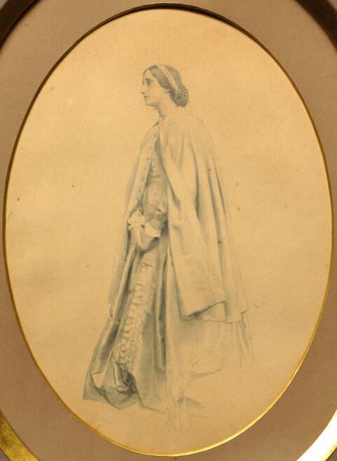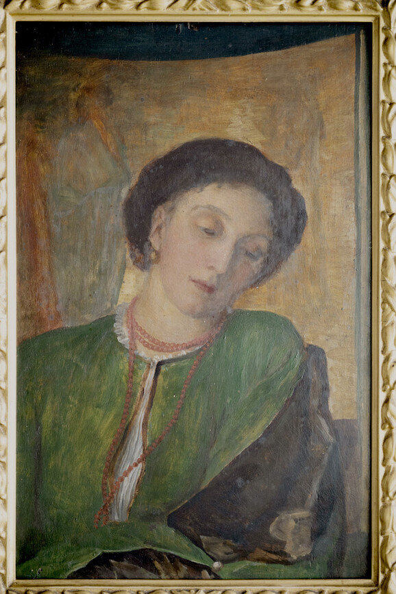 This small oil of Sara from 1864 captures a rare closeness in profile. Painted during a difficult period in Watts’s life, the portrait reveals unexpected tenderness. She was widely known – even among her sisters – for her strong will and outspoken opinions, traits that could occasionally cause friction within the family. Yet Watts presents her with notable tenderness; the creamy tones of her plump skin and the faint blush of youth soften her features, while her heavy-lidded gaze suggests a quiet sadness.