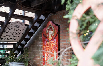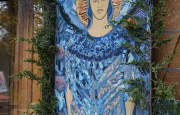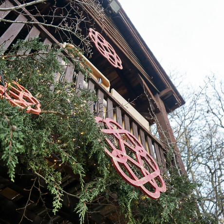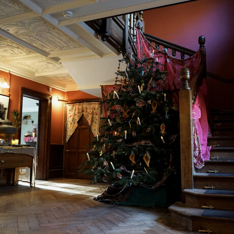 This years Watts Christmas decorations have a loose Indian theme to work with our new exhibition, Women of Influence: The Pattle Sisters. For the outside decorations, we have used Celtic-inspired fretwork, using geometric shapes painted in deep pink and coral, with displays with foraged greenery from the estate and lights. We have also used 3 decoupage panels created by the Watts Garden volunteers to designs by Jonathan Moore inspired by the interior of the Watts Chapel, the seraphim angels. These were created for the Big Give Compton phone box in 2022. The angels are located by the Visitor Centre door and by the entrance to Limnerslease house.