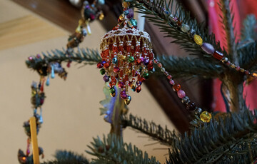 This is the third year that we have put a Christmas tree in the Chapel, and it’s becoming very popular with visitors. The tree is 12 foot high and has 3000 lights, again it’s been donated by Hans Christmas Andersen with baubles from Ruth. Other handmade decorations include ceramic and painted decorations by the garden volunteers also hand painted paper lanterns and folded shapes all in keeping with the Chapel interior and colours.