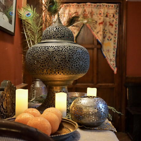 The mantles have been dressed with Indian objects and candles , to create an opulent look.