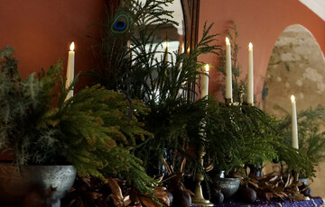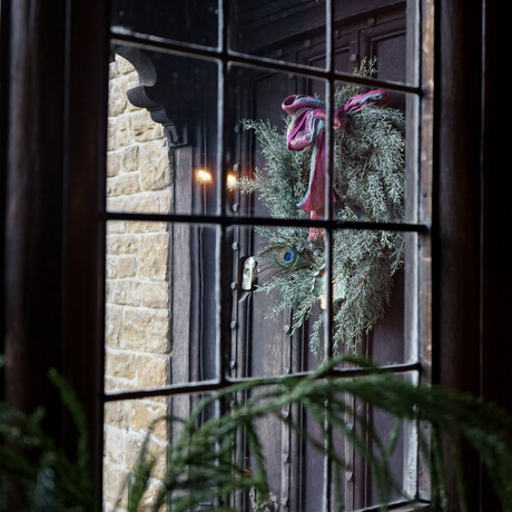 This is a bit of an Indian fantasy I’ve created as if the Pattle Sisters have arrived for Christmas, from India with trunks of Indian fabrics and ornaments. Entering from the oak door is a wreath of aromatic cypress decked with peacock feathers and a embroidered ribbon.