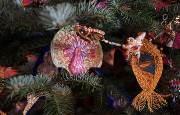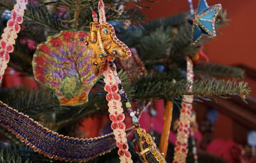 The tree is decorated with hand made ceramic and painted peacocks made by the garden volunteers. Also with Indian ribbon and decorations some from All for Love London. I’m very indebted to my great friend Nik Clarké who allowed us to use her collection of vintage saris and other decorations from her house in Spain , these are used to dress the staircase and mantle’s.