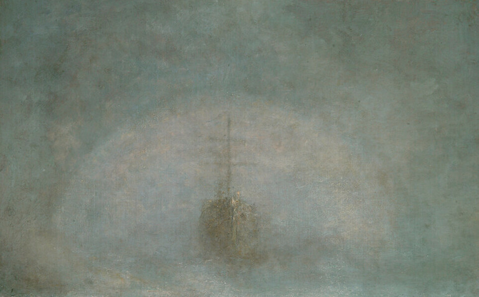 In this incredibly atmospheric work, George uses closely varying shades of blue and grey to capture the eerie appearance of the towed ship through the mist. A Sea Ghost is strikingly close to the imagery of Turner, an artist Watts exhibited alongside in London as a young artist.