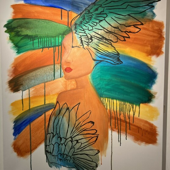 1. Acrylic painting by Fiona Millais of a landscape with shades of greens and orange