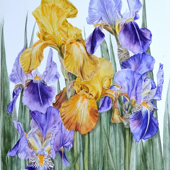 5. Cyanotype print of plant silhouettes. White imprints of wildflowers and grasses are superimposed against a mottled background of deep blue, beige, and light yellow, evoking a watercolour effect. The composition is a close up and the image is softly focused.