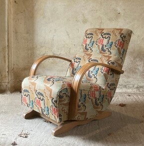 1930s chairs covered in “Clouds” fabric designed by Duncan Grant. Kindly supplied by Greenham Makers