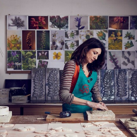 Kay Aplin is an architectural ceramist, creating site-specific commissions for the public realm and large-scale tiled installations for exhibitions. Her work responds to place and her process often involves using a microscope to magnify hidden forms in nature. Exhibitions include Kogei Triennial Kanazawa, Japan, European Ceramic Context, Denmark, British Ceramics Biennial and Collect, Saatchi Gallery, London.